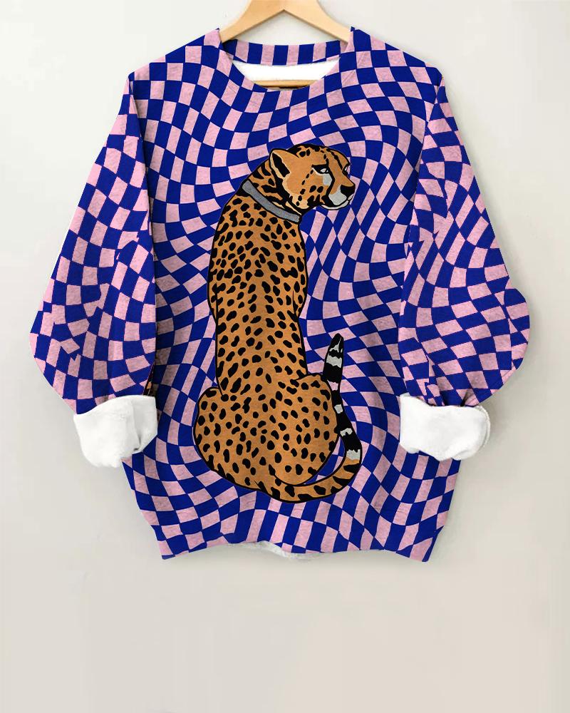 Women's Plaid Leopard Print Long Sleeve Round Neck Sweatshirt