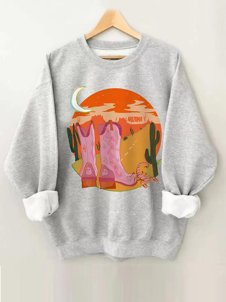 Women's Cowboy Boots Print Round Neck Sweatshirt